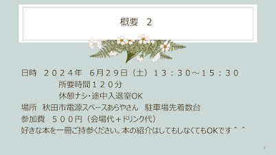 あの本この本の話題・読書会での紹介本読みました~・なんでこの本を手にしたの?・図書館利用ってどうしてる?・読書会アフターはいかに・あの時話しそびれた・私の読書習慣・書店での過ごし方、、、
